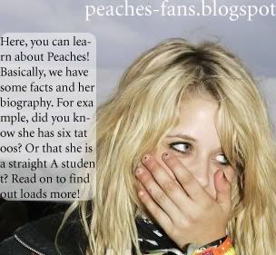 Peaches Honeyblossom (Michelle Charlotte Angel Vanessa) Geldof was born on 16th March 1989, the second daughter of Bob Geldof and Paula Yates (deceased). Due to life in the media, Peaches had a very swift change from childhood into young adulthood. Some say that this quick and premature move was a bad example for young people.